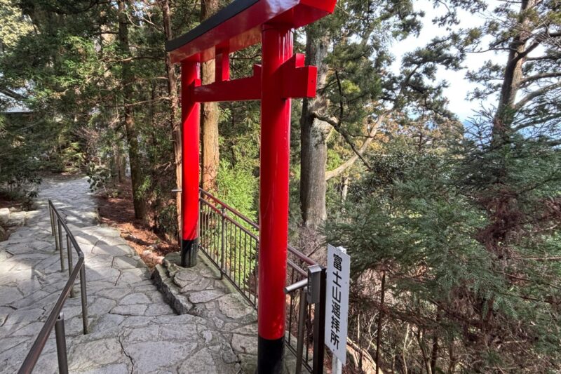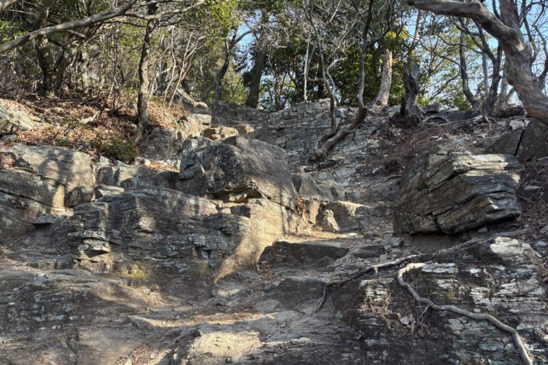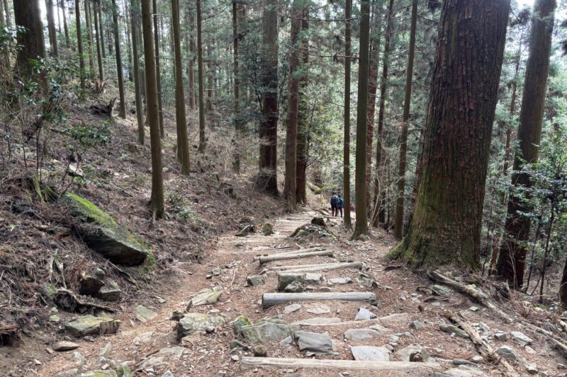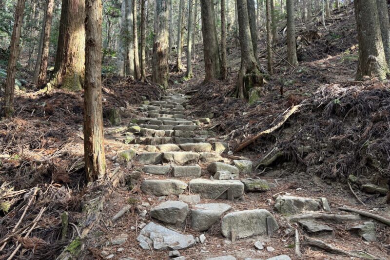 最初は歩きやすい道が続くけれど、20丁目を過ぎたあたりから少しずつ岩が増えて歩きごたえが出てきます。40丁目を超えていったん車道に出て、もう一度登山道に入ってからは……階段地獄。さっきまでの歩きやすい道はどこへ?と思うほど、修行のような階段が続きました。
