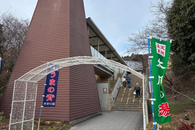 下山後すぐに温泉に入れます。建物内に入るときに最後の登り(階段)が…。