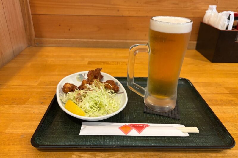 電車登山でも、下山してすぐ温泉に入れるのが最高。バスの時間を調べたうえで、待ち時間にビール+タコの唐揚げ。