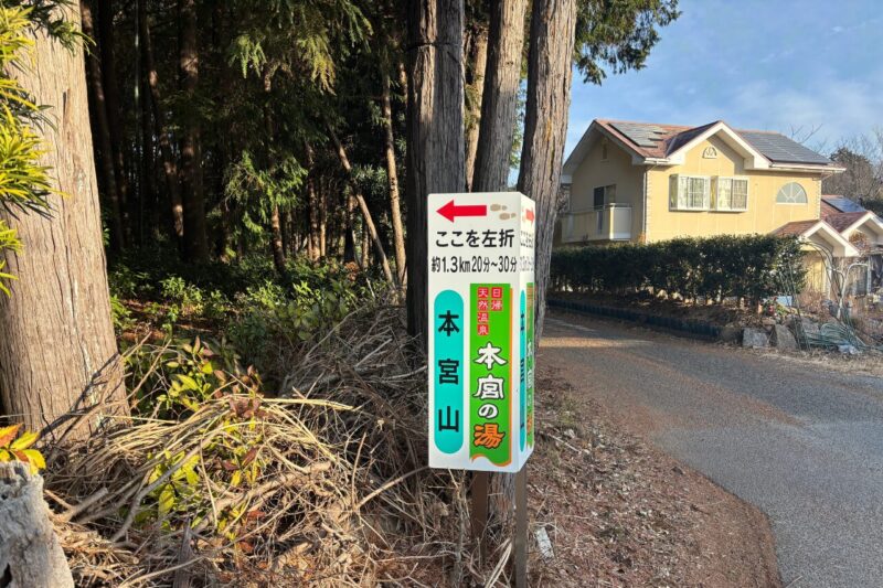 「徒歩30分かぁ…まぁまぁ長いな」と思いつつ歩き始めたけれど、途中で本宮山が見えてくるとわくわくして、結果あっという間に感じました。道中は本宮の湯の看板が目印になって、迷いにくかったです。